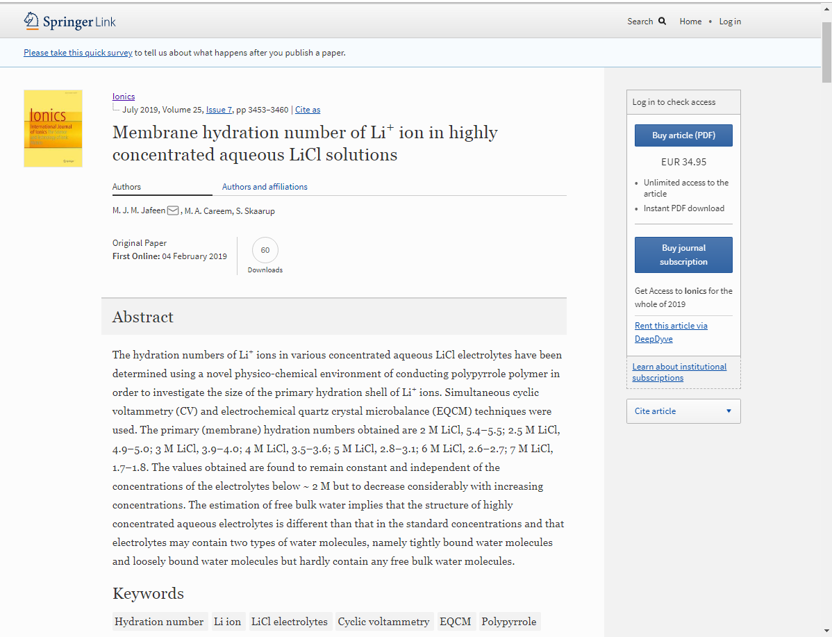 The hydration numbers of Li+ ions in various concentrated aqueous LiCl electrolytes have been determined using a novel physico-chemical environment of conducting polypyrrole polymer in order to investigate the size of the primary hydration shell of Li+ ions. Simultaneous cyclic voltammetry (CV) and electrochemical quartz crystal microbalance (EQCM) techniques were used. The primary (membrane) hydration numbers obtained are 2 M LiCl, 5.4–5.5; 2.5 M LiCl, 4.9–5.0; 3 M LiCl, 3.9–4.0; 4 M LiCl, 3.5–3.6; 5 M LiCl, 2.8–3.1; 6 M LiCl, 2.6–2.7; 7 M LiCl, 1.7–1.8. The values obtained are found to remain constant and independent of the concentrations of the electrolytes below ~ 2 M but to decrease considerably with increasing concentrations. The estimation of free bulk water implies that the structure of highly concentrated aqueous electrolytes is different than that in the standard concentrations and that electrolytes may contain two types of water molecules, namely tightly bound water molecules and loosely bound water molecules but hardly contain any free bulk water molecules.