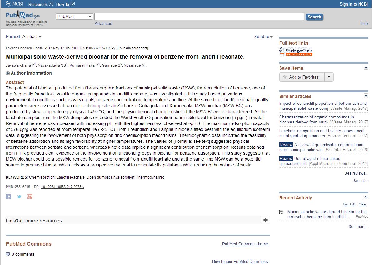 The potential of biochar, produced from fibrous organic fractions of municipal solid waste (MSW), for remediation of benzene, one of the frequently found toxic volatile organic compounds in landfill leachate, was investigated in this study based on various environmental conditions such as varying pH, benzene concentration, temperature and time. At the same time, landfill leachate quality parameters were assessed at two different dump sites in Sri Lanka: Gohagoda and Kurunegala. MSW biochar (MSW-BC) was produced by slow temperature pyrolysis at 450 °C, and the physiochemical characteristics of the MSW-BC were characterized. All the leachate samples from the MSW dump sites exceeded the World Health Organization permissible level for benzene (5 µg/L) in water. Removal of benzene was increased with increasing pH, with the highest removal observed at ~pH 9. The maximum adsorption capacity of 576 µg/g was reported at room temperature (~25 °C). Both Freundlich and Langmuir models fitted best with the equilibrium isotherm data, suggesting the involvement of both physisorption and chemisorption mechanisms. Thermodynamic data indicated the feasibility of benzene adsorption and its high favorability at higher temperatures. The values of [Formula: see text] suggested physical interactions between sorbate and sorbent, whereas kinetic data implied a significant contribution of chemisorption. Results obtained from FTIR provided clear evidence of the involvement of functional groups in biochar for benzene adsorption. This study suggests that MSW biochar could be a possible remedy for benzene removal from landfill leachate and at the same time MSW can be a potential source to produce biochar which acts as a prospective material to remediate its pollutants while reducing the volume of waste.