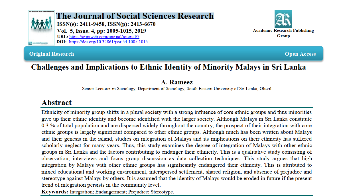 Challenges and implications to ethnic identity of minority Malays in Sri Lanka
