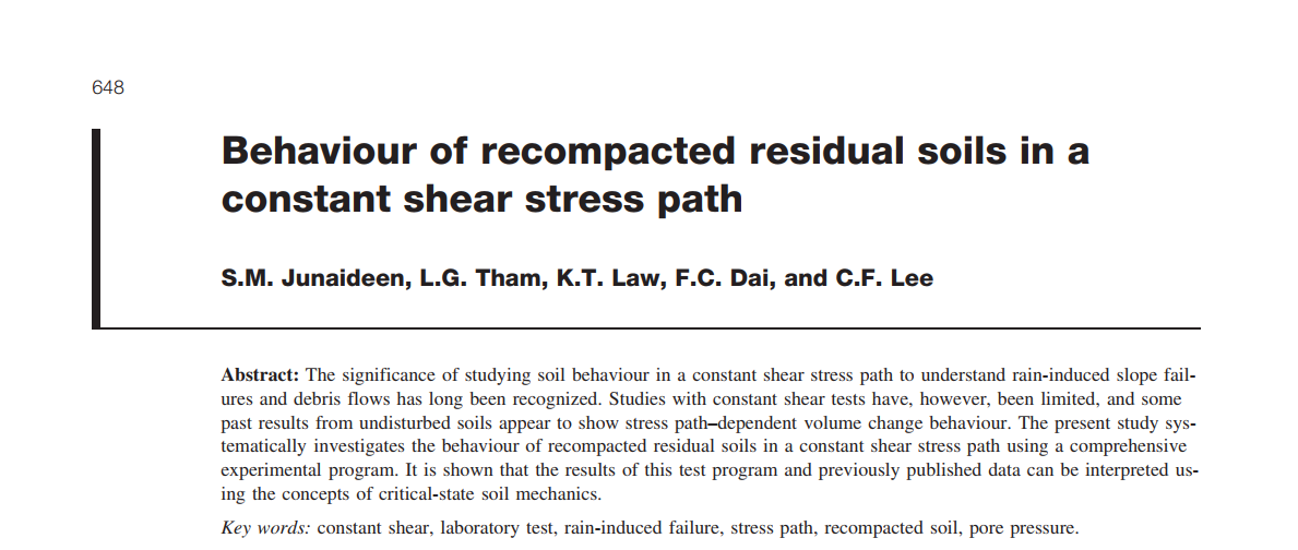 past results from undisturbed soils appear to show stress path–dependent volume change behaviour. The present study systematically investigates the behaviour of recompacted residual soils in a constant shear stress path using a comprehensive
