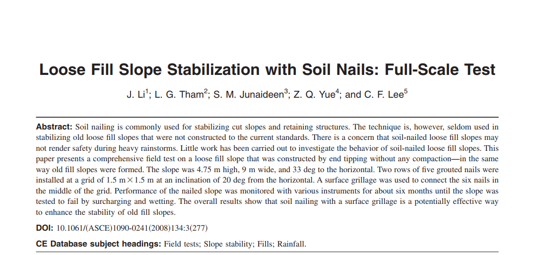 stabilizing old loose fill slopes that were not constructed to the current standards. There is a concern that soil-nailed loose fill slopes may